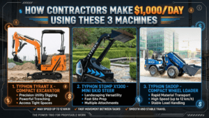 The TYPHON TERROR LXV is built for the toughest job sites. Featuring a commercial-grade Kubota V2607 engine and enclosed AC cabin, this 6.6-ton powerhouse delivers precision trenching and heavy lifting capability in a compact footprint.