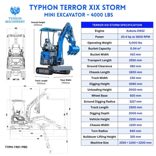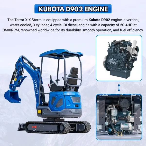 TYPHON TERROR XIX STORM mini excavator (compact) built for tight-site digging and repeatable daily performance with Kubota power.