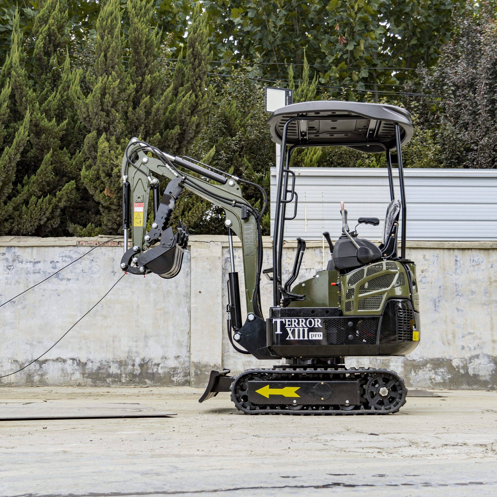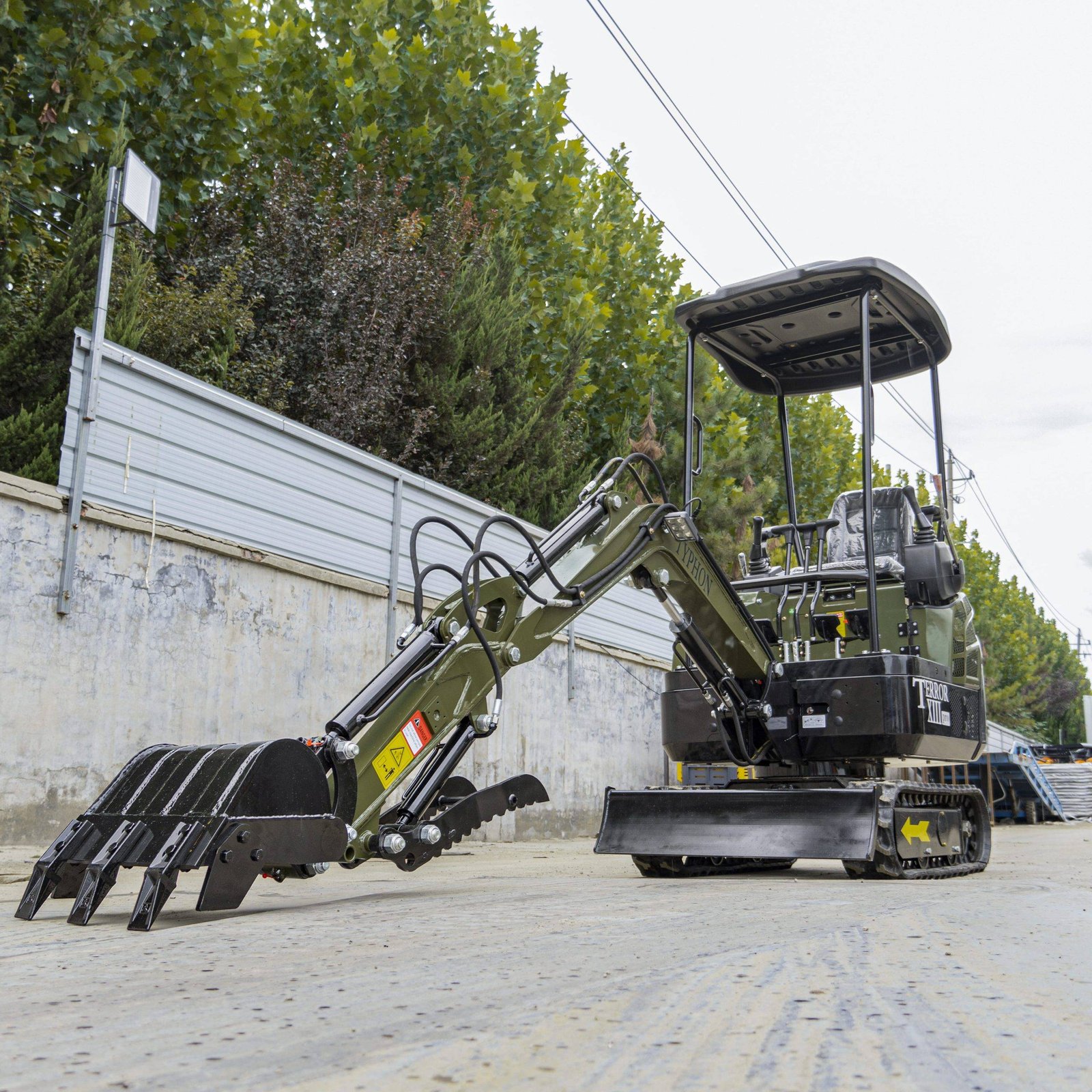 The TYPHON TERROR XIII PRO STORM Mini Excavator is a 1.3 ton trench digger with a canopy and a hydraulic thumb clip. It’s perfect for modest construction jobs. This little but powerful machine is designed to be easy to move around and work well in a variety of places, such as farms, gardens, public spaces, parks, orchards, and more.